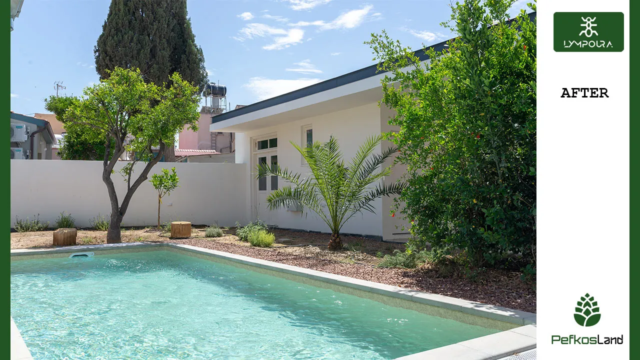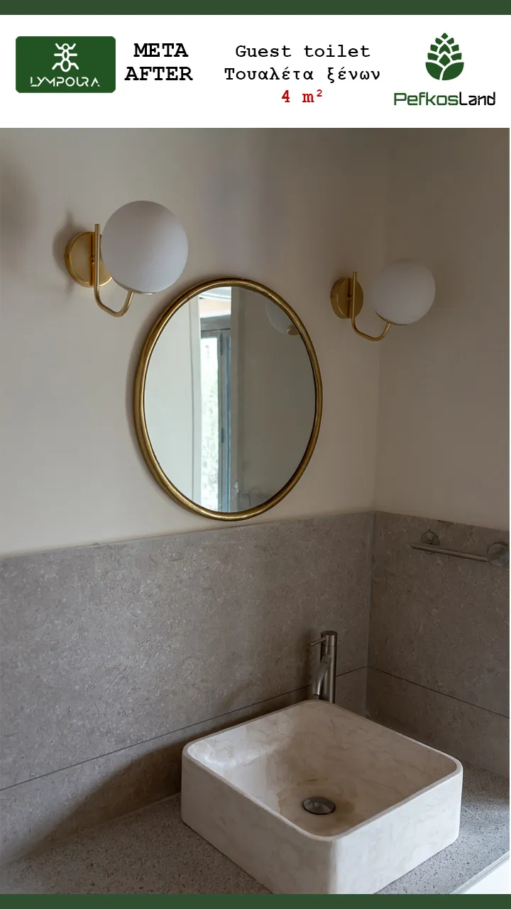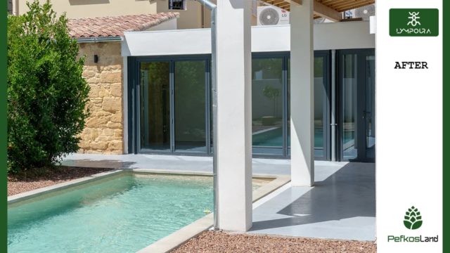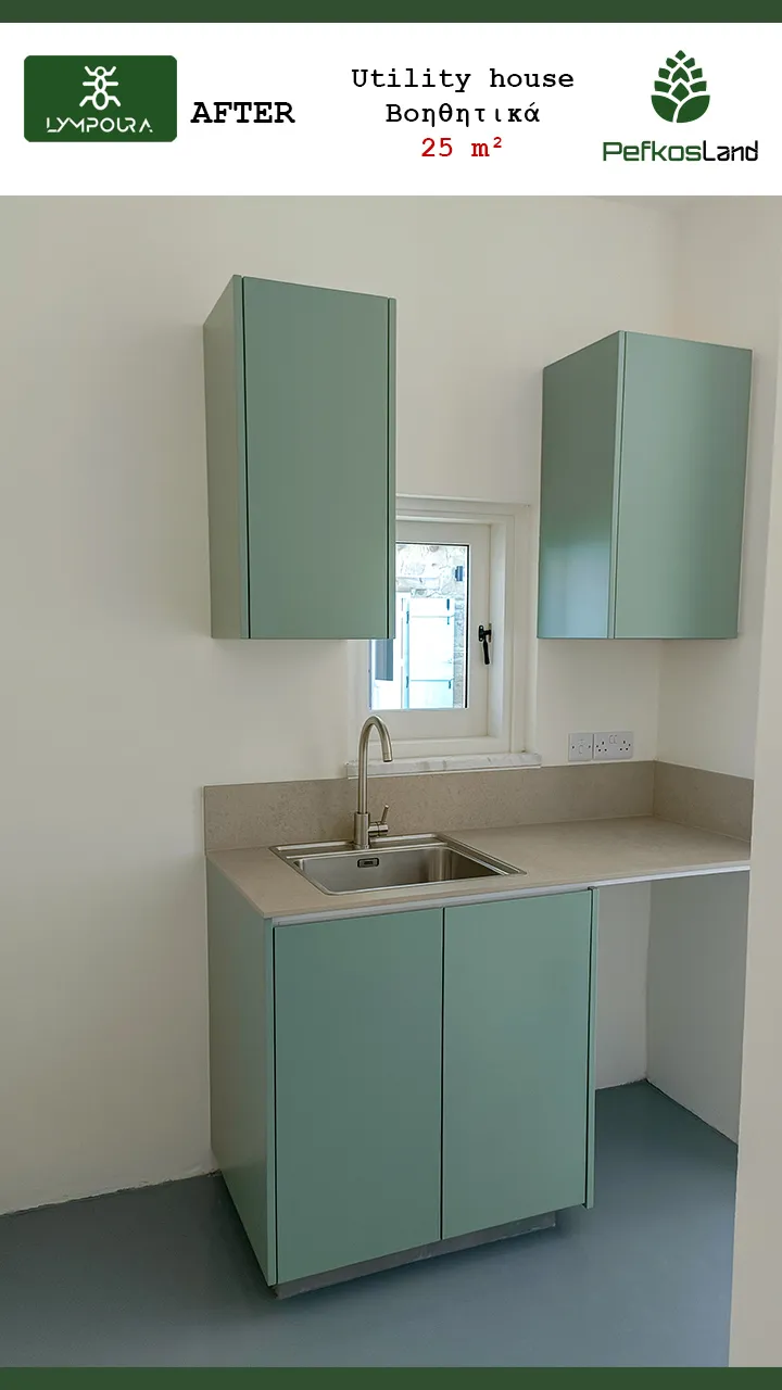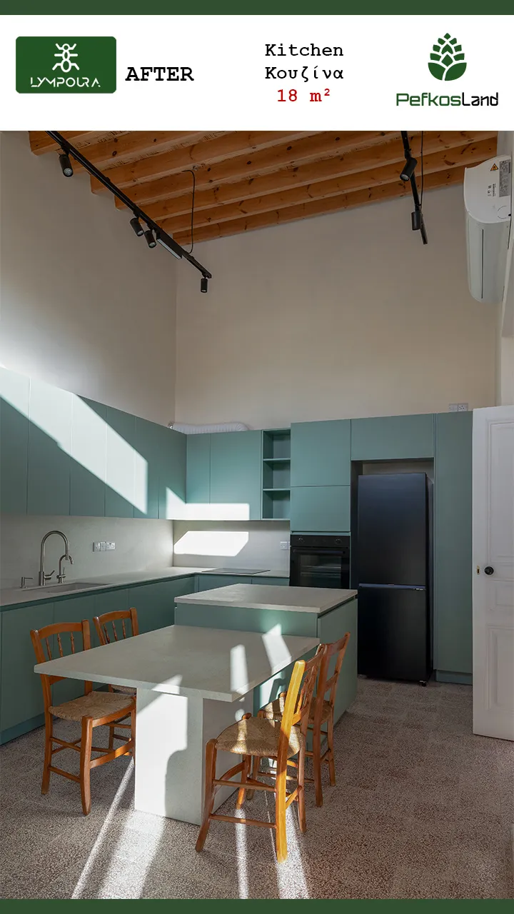 With the addition of a new modern construction, a living room, made of metal beams and aluminium folding glass doors, the now modern and functional kitchen is connected to the ‘Cooking room’ which has been converted into an office/bedroom. In the western part of the plot there is a newly built utility room with toilet and shower.